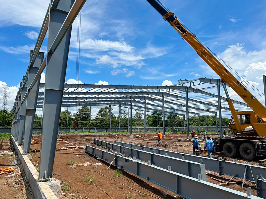 Khung thép tiền chế là giải pháp được nhiều doanh nghiệp lựa chọn nhờ thời gian thi công nhanh hơn so với xây dựng truyền thống. Kết cấu thép có khả năng chịu lực tốt, độ bền cao và đặc biệt dễ dàng mở rộng khi doanh nghiệp cần tăng quy mô sản xuất.